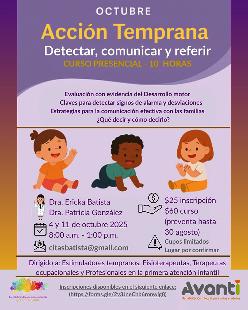 Las doctoras Ericka Batista y Patricia González les invitan a participar del curso presencial de evaluación del neurodesarrollo para identificar señales de alarma en el desarrollo motor y a comunicar con empatía a los familiares. Se realizará en 2 módulos los días 4 y 11 de octubre del 2025. Lugar por confirmar en ciudad de Panamá