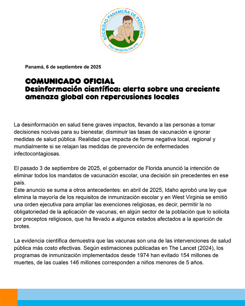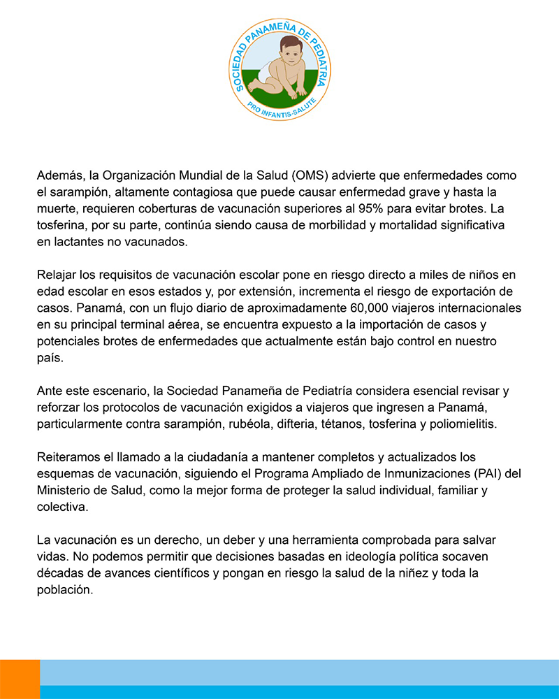 La Sociedad Panameña de Pediatría considera esencial revisar y reforzar los protocolos de vacunación exigidos a viajeros que ingresen a Panamá, particularmente contra sarampión, rubéola, difteria, tétanos, tosferina y poliomielitis. Ante ciertas políticas de disminuir tasas de vacunación.